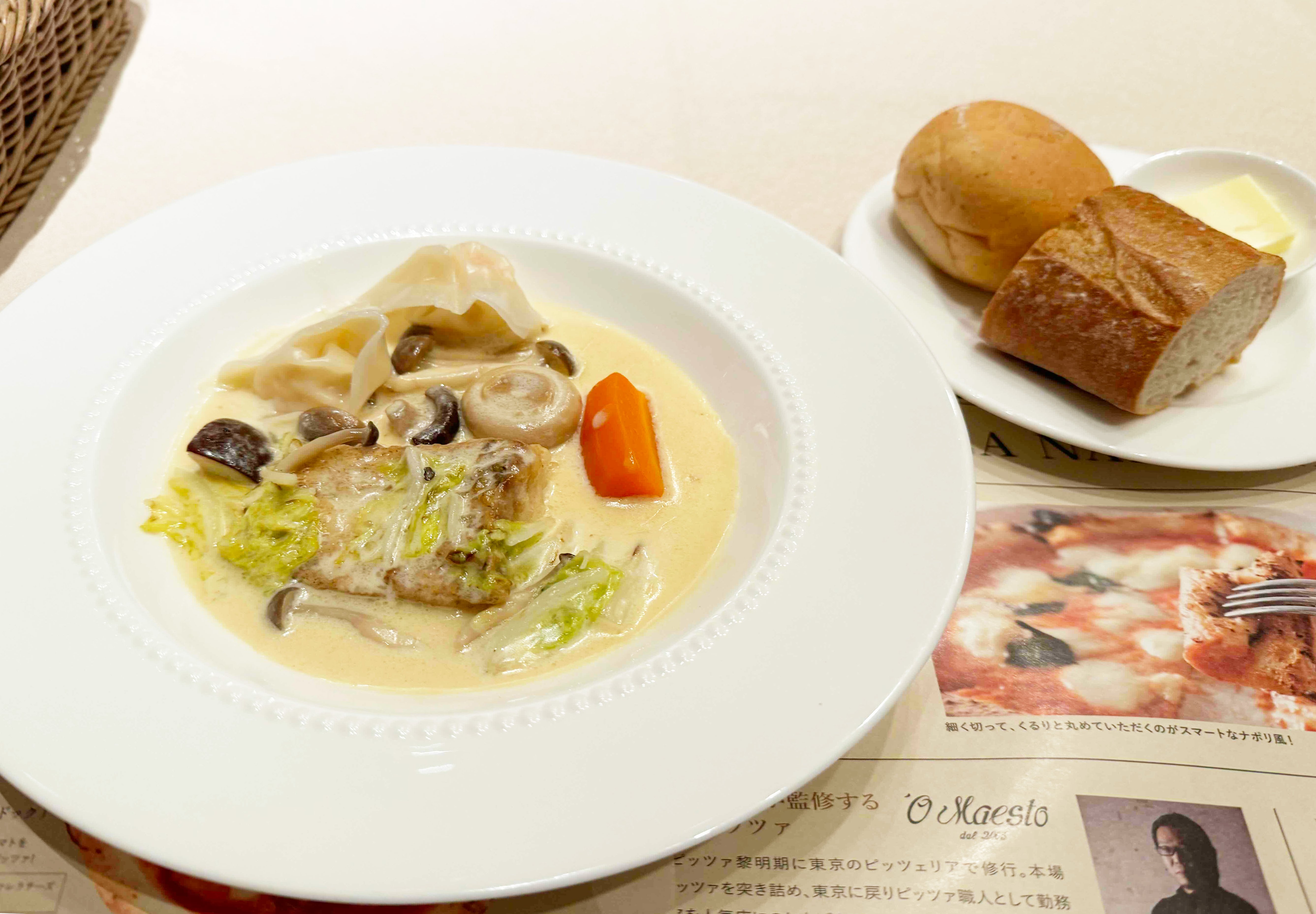 ランチセットにはスープ、サラダ、パンまたはライス、セルフドリンクが付いています。