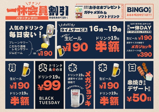 ・タイムサービス&曜日サービス対象ドリンクを統一して19種類に!