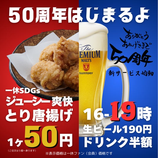 この唐揚げは毎日手仕込みで丁寧に味付けし、衣に使用している独自の粉は油の吸収を通常の半分程度に抑えた商品です。健康にはもちろん、使用する油の量を減らすことで環境にも優しい一休名物が50周年にちなんで1ヶ50円、通常会員価格5ヶ530円→250円でご提供いたします。ぜひ一人一皿ご注文ください。
