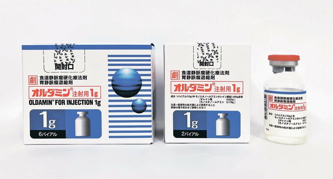 オルダミン注射用1グラムは1991年、肝硬変の合併症として知られる食道静脈瘤の硬化療法剤として、国内で初めて承認され、2017年に胃静脈瘤への適応が追加承認された。静脈奇形への適応追加に向け、21年から臨床試験を始めた。
