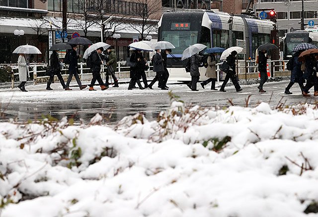 富山市では8日朝、3学期が始まり雪の中を通学する児童が見られた。県警によると、雪や凍結による車のスリップ事故は午前8時半~午後4時に17件あり、3人が軽傷を負った。