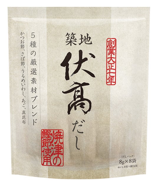 大正7年に日本橋の鮮魚仲卸として創業した伏高は、関東大震災で中央卸売市場が築地へ移転したのを機に、かつお節仲卸となりました。飲食店へのかつお節、昆布、煮干しなどの卸売を生業としています。2023年にマルコメグループとなり、販路を全国に拡大しました。今回の「伏高だし 5種ブレンド」は伏高がかつお節、さば節、うるめいわし、あご、真昆布の素材をブレンドしたみそ汁にも合うだしパックです。日本の伝統的な素材を使った優しい旨みと味わいを、個包装で1回ずつ使える仕様にしました。