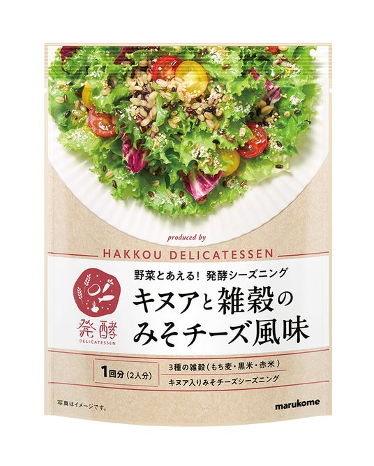 マルコメ株式会社(本社:長野市、代表取締役社長:青木時男)は、発酵をテーマにした惣菜店「発酵DELICATESSEN」の人気No.1メニュー「ケールとキヌアの味噌チーズサラダ」を家庭で簡単に再現できるサラダの素「キヌアと雑穀のみそチーズ風味」を3月上旬より全国で販売します。
