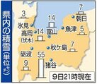9日の県内は冬型の気圧配置が強まり、広い範囲でで雪が降った。午後9時時点の積雪は富山と高岡(伏木)が14センチ、富山市猪谷が55センチなどとなった。富山地方気象台は同日、全15市町村に大雪警報を出し、警戒を呼びかけた。10日も強い冬型の気圧配置が続いて大雪になる見込みで、同日午後6時までの24時間降雪量は多い所で平野部50センチ、山間部70センチを予想。激しい突風やひょうにも注意するよう促している。