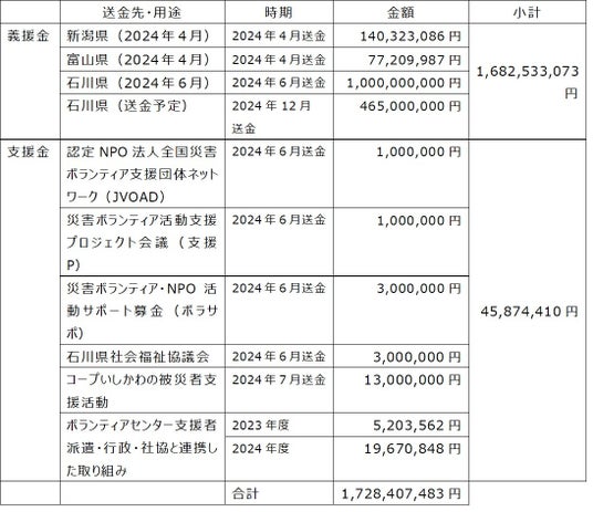 ※各生協が実施した募金活動で組合員・役職員等から寄せられた募金のうち、日本生協連が開設した口座に振り込まれた金額です。各生協が独自に各自治体・団体等に送金しているものは含まれません。