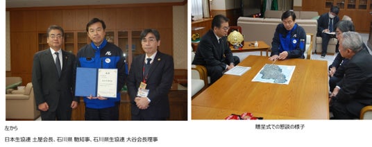 日本生活協同組合連合会(略称:日本生協連、代表理事会長:土屋敏夫)は、2024年1月1日に発生した能登半島沖での大規模な地震の被災者・被災地を支援するため「令和6年能登半島地震災害募金」に取り組んできました。さらに、2024年9月20日から22日に発生した豪雨を受け、寄付先を豪雨災害への支援にも広げ、改めて募金を呼びかけました。全国220生協から募金が寄せられ、2024年6月に贈呈した10億円に加え、新たに義援金4億6,500万円を石川県に贈呈しました。義援金の贈呈式は、2025年1月9日に石川県庁にて行われました。