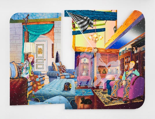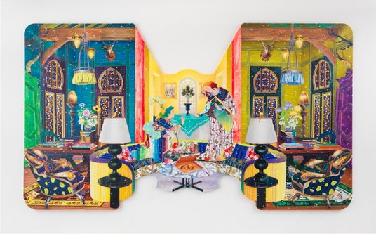 松山智一《Harmless Charm》 2022 H233 x W122 cm (center piece) 76.2 cm (other pieces) Acrylic and mixed media on canvas