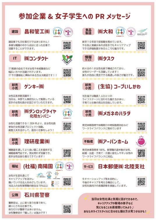 石川県内で女性が多く活躍している企業が参加し、女性社員が自身のキャリアや働き方について紹介します。