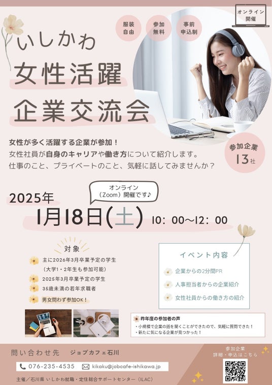県内企業への就職を検討する学生向けに、2025年1月18日(土)にオンラインイベント「いしかわ女性活躍企業交流会」を開催いたします。