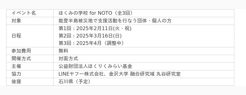 そこで、当財団では現地で支援活動を継続されている団体の方々を対象に、能登半島地震及び豪雨災害から復興に向かう今後の支援プロセスや、多様性を支える具体的な支援や各地の実態について学び合い、今後の支援の充実を図るための連続学習会を開催します。