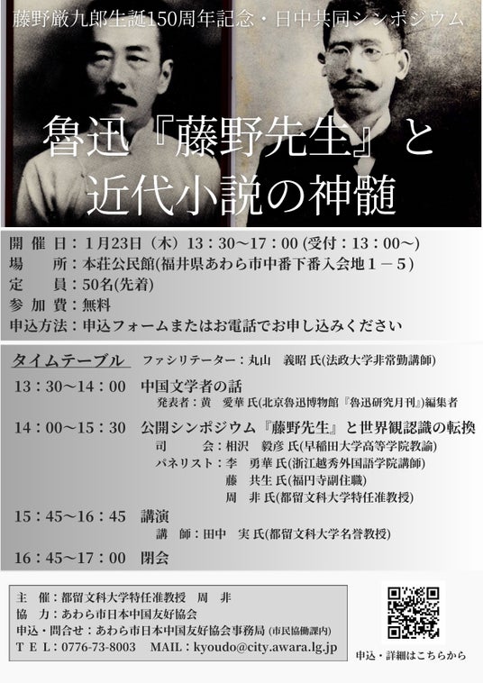 - 14:00~15:30: 公開シンポジウム「藤野先生」と世界観認識の転換