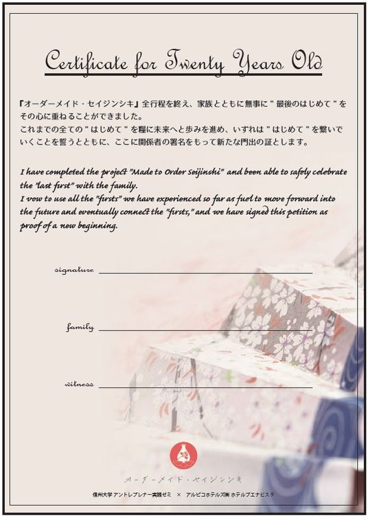 オーダーメイド・セイジンシキを締めくくる「二十歳の証明書」と署名式の様子