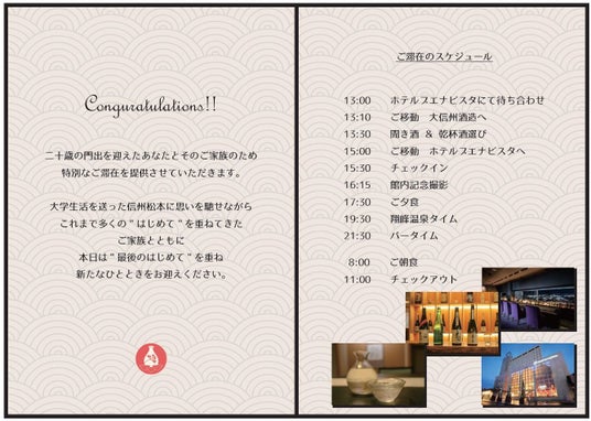 本プランは、2022年に締結された信州大学とアルピコグループとの包括的連携協定に基づき、信州大学アントレプレナー実践ゼミとホテルブエナビスタとの連携により商品化に至ったもので、20歳を迎えたお子様とそのご家族が“家族と重ねる最後のはじめて”をテーマに、特別な時間を共有できる新しい成人式の過ごし方を提供します。