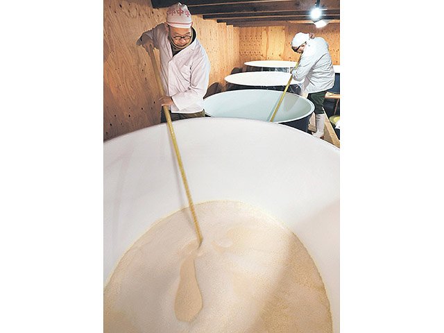 富山県内の酒造会社で、新酒の仕込みが進んでいる。日本酒「有磯曙」を製造する氷見市北大町の高澤酒造場では13日も、ずらりと並んだタンクに入ったもろみを蔵人が丁寧にかき混ぜた。