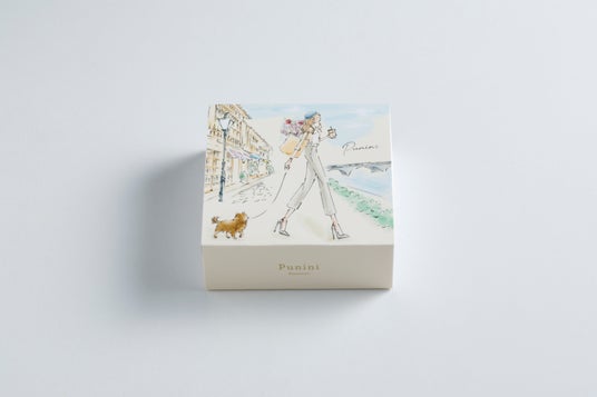 古都金沢から、和菓子の枠組み超えるお菓子を世界に発信したいPuniniの想いを込めた限定デザイン。金沢三茶屋街の一つ、浅野川沿いに風情ある料理屋や茶屋が立ち並ぶ「主計町(かずえまち)茶屋街」をモチーフに、情緒あるパリのセーヌ河岸をシンクロさせた街並みを歩く、強く優しく生きる美しい女性を描いています。