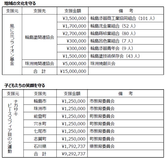 寄付金総額¥24,292,737のうち、輪島塗関連協会6団体へ総額1,000万円、珠洲焼創炎会へ500万円を公益財団法人風に立つライオン基金(所在地:東京都港区、代表:古竹孝一)を通じて寄付。能登6市町と石川県の教育委員会へ929万2,737円を特定非営利活動法人ナガサキピーススフィア貝の火運動(所在地:長崎県長崎市 代表:松田裕二)を通じて寄付。それぞれ「能登の文化を守るために」「子どもたちの笑顔を守るために」役立てていただきます。