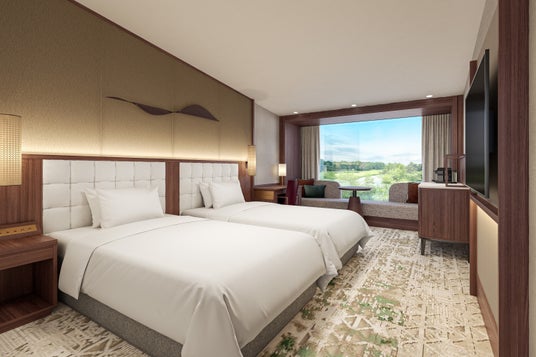 1~3階の客室の一部、計65室をフロアごとに段階的にリニューアルします。ゴルフコースの開けた景色の向こうに浅間山を望むピクチャーウインドウを生かし、3階の「エグゼクティブスイート」「エグゼクティブキング」「エグゼクティブツイン」の窓際にはデイベッドを新たに設えることでより開放的にくつろげる空間となります。また、リニューアルの対象となるそのほかの客室でも壁紙、絨毯、家具を刷新します。