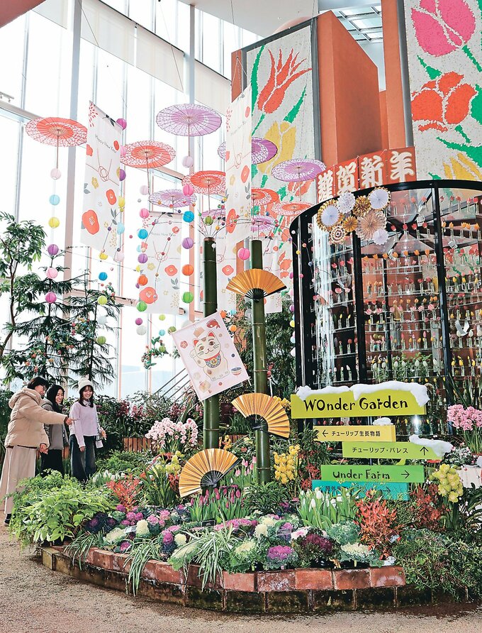 促成栽培したチューリップのほか、和傘や扇の装飾、松竹梅の寄せ植えなどもある。担当者は「縁起物の植物などを見て、初春の雰囲気を感じてほしい」と話している。