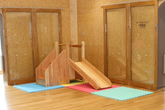 建物には児童館の機能を移転した「こどもホーム」が入居。ホーム内の子育て支援センターは赤ちゃん向けのおもちゃや遊具が充実しています。県産スギでできた滑り台は気持ちのいい香り。幼児用のシャワー室や授乳室も整備されています。
