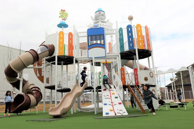 屋外広場は建物内から出入りし、児童向けエリアと乳幼児向けエリアが設けてあります。児童向けエリアには立山黒部アルペーンルートのロープウェイや黒部ダムなど、立山町の観光スポットをイメージした複合遊具が設置してあり、遊びごたえがありそうです。