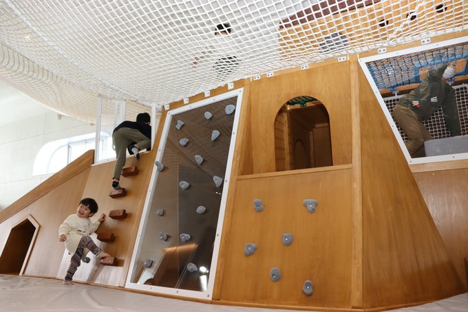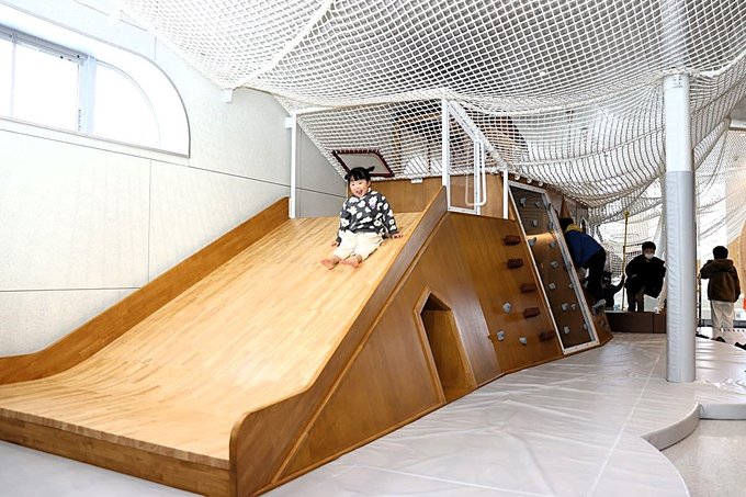 建物内の遊び場スペースには吹き抜けの天井を利用し、ネット遊具と木製遊具がセットで設置されています。 ネット遊具は「立山の雲上に行こう」がコンセプト。木製遊具は山小屋をイメージしているそう。二つの遊具の全長は17メートルもあり、合わせて50人近くが遊べるほどの広々とした空間です。