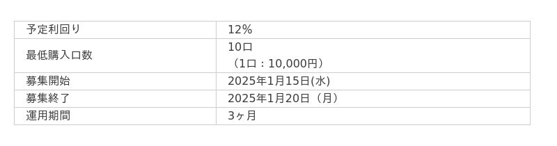 ・各商品に係る手数料並びにリスク等の内容や性質は、投資対象によって異なります。実際に投資をされる際は、各商品のファンドページ、匿名組合契約約款、重要事項説明書等の内容を十分にご確認、ご理解の上、ご自身の判断と責任によりお申し込みください。