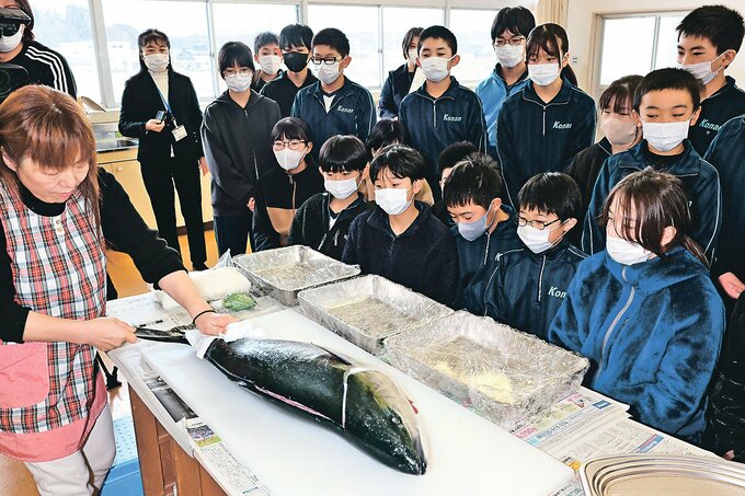 富山県氷見市の小学生を対象にした「氷見の魚(寒ブリ)を知ろう事業」は15日、湖南小学校で始まり、6年生がブリの解体を見学し、刺し身を味わった。