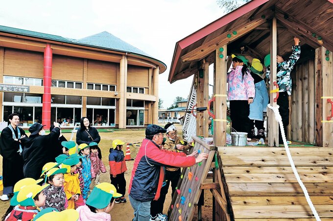 富山県氷見市栄町の認定こども園「ひみ中央こども舎」の年長児25人は16日、園庭で製作が進められてきた、ひみ里山杉を使った木製遊具の仕上げを手伝い、完成に立ち合った。遊具には保育士のアイデアが詰まっており、園児たちは遊ぶのを楽しみにした。