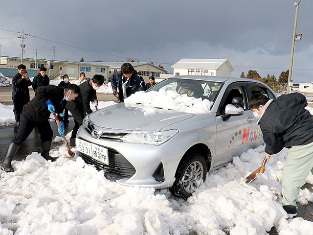 今冬は雪が少ないため、敷地内の雪を1カ所に集めてスタックした車を再現。受講者が職員から優しくアクセルを踏むなどの運転方法を教わりながら脱出を試みたものの動かず、最後は受講者数人で車を押して雪道から抜け出した。笹嶋工業の惣田泰地さん(19)は「今シーズンはまだ雪が少ないが、スタックしたら大変だと分かった」と話した。