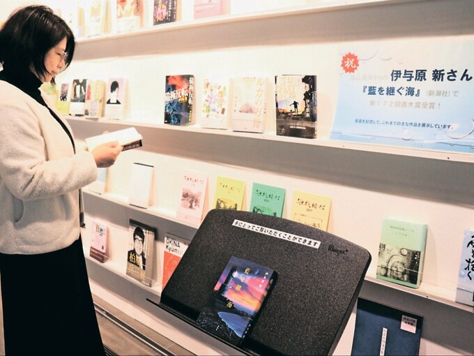 受賞作「藍(あい)を継ぐ海」のほか、デビュー作で横溝正史ミステリ大賞を受賞した「お台場アイランドベイビー」、「ルカの方舟」など著作6冊を並べた。同館の生田美秋(よしあき)事業部長は「理系の題材が小説とうまく融合しており、文体に透明感がある。文学館にもぜひお呼びしたい」と言う。