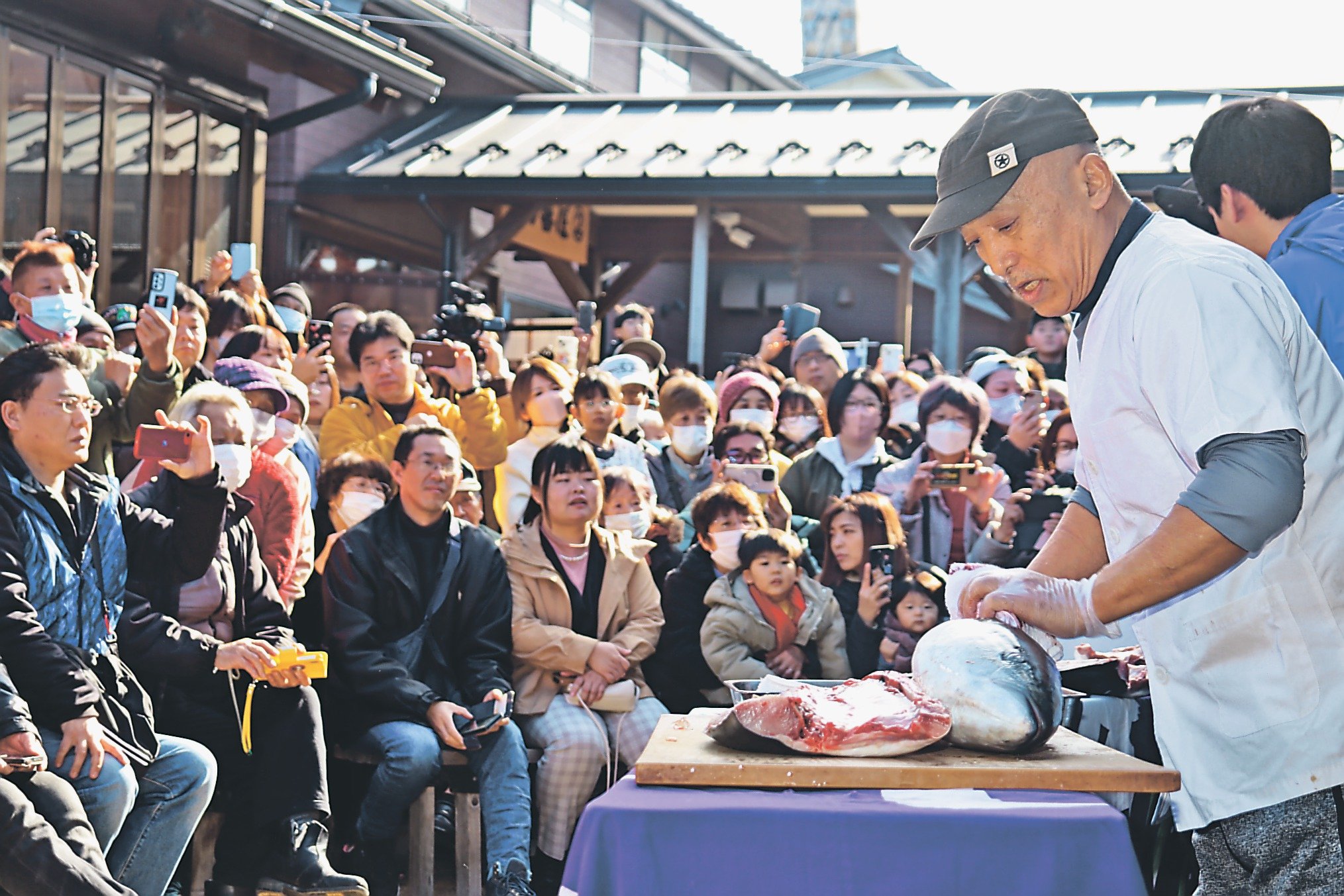 解体ショーでは、番屋街に店がある東軒満彦さん(魚廣)と河端幸作さん(ばんや鮮魚直売所)が「鉄人」として登場し腕前を披露。10キロ以上のひみ寒ぶりが用意され、三枚おろしや焼き用、ぶりしゃぶ用などに切り分けた。来場者は巧みな包丁さばきに写真を撮りながら見入っていた。
