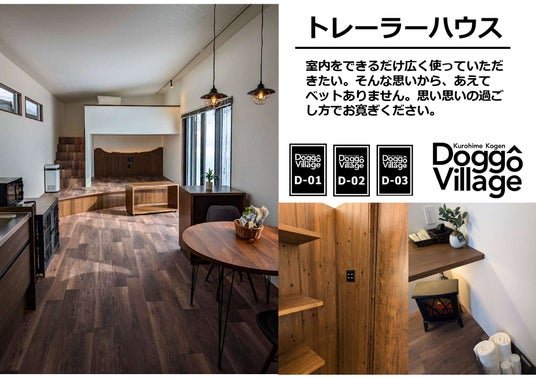 【 DoggoVillege 】。トレーラータイプが3棟・キャビンタイプが1棟とその名の通り小さな“村”のような宿泊エリアとなっています。