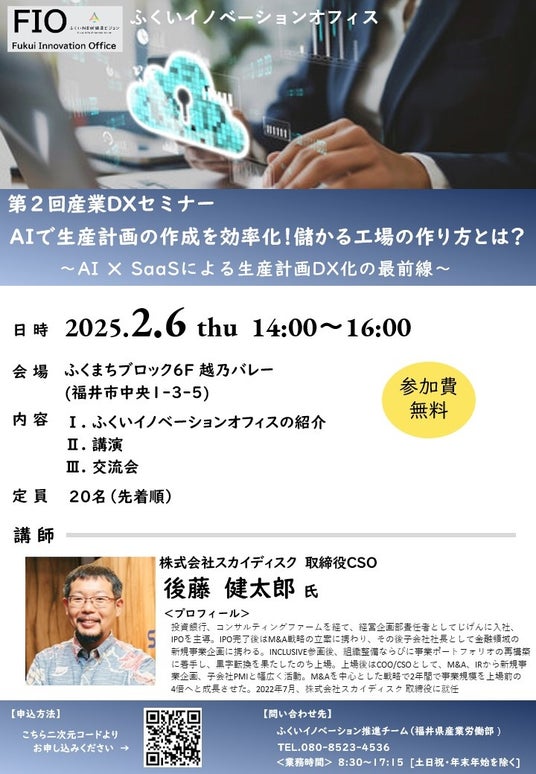 株式会社スカイディスク(本社:福岡県福岡市中央区、代表取締役CEO:内村 安里、以下「スカイディスク」)は、福井県産業労働部 が主催する「第2回産業DXセミナー AIで生産計画の作成を効率化! 儲かる工場の作り方とは?~AI × SaaSによる生産計画DX化の最前線~」に登壇いたします。