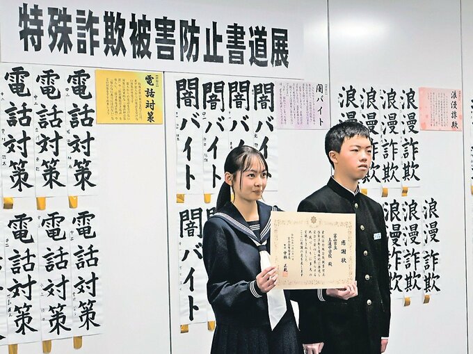 「家族の絆」「水際阻止」「闇バイト」「浪漫詐欺」と書いた作品もある。富山南署で21日、感謝状の贈呈があり、生徒を代表して西野夏葵(なつき)さん(2年)が受け取り、安川凪埜羽(なのは)さん(同)が「1年間、詐欺被害が少なくなってほしいとの思いを込めました」と述べた。