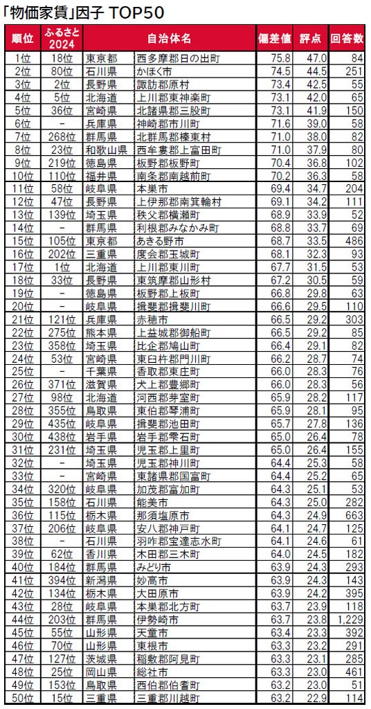 ●「物価家賃」因子は、1位東京都西多摩郡日の出町、2位石川県かほく市、3位長野県諏訪郡原村です。