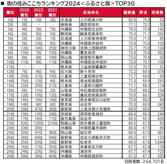 北海道上川郡東川町が、3年連続で1位に輝きました。2位は昨年3位の長野県諏訪郡原村、3位は昨年4位の沖縄県中頭郡北谷町です。トップ10内で最も多くランクインしているのは沖縄県の自治体(4自治体)、次いで北海道(2自治体)となっています。