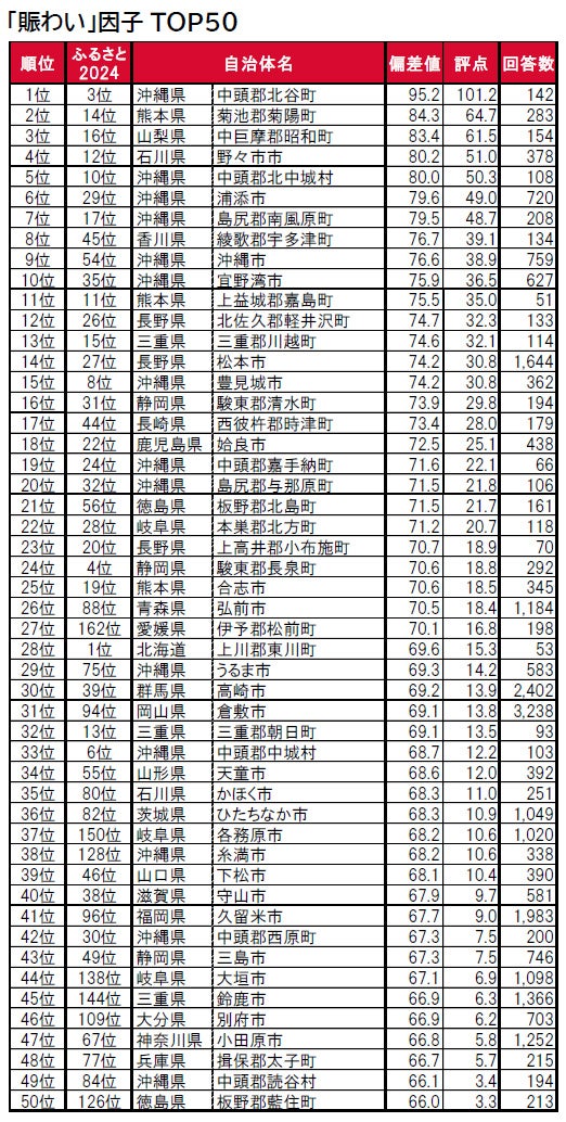 ●「賑わい」因子は、1位沖縄県中頭郡北谷町、2位熊本県菊池郡菊陽町、3位山梨県中巨摩郡昭和町です。1位の沖縄県中頭郡北谷町は、「住みここち<ふるさと版>」では3位の自治体で、唯一偏差値90台の極めて高い評価を得ています。