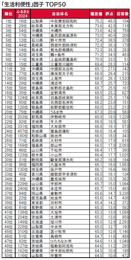 ●「生活利便性」因子のトップ10の自治体のうち、7自治体が郡部に属する「町」となっています。●「生活利便性」因子で1位~9位までの自治体は偏差値70以上の高い評価、10位~50位も偏差値60以上で、生活利便性が良い街として相対的に良い評価を得ています。