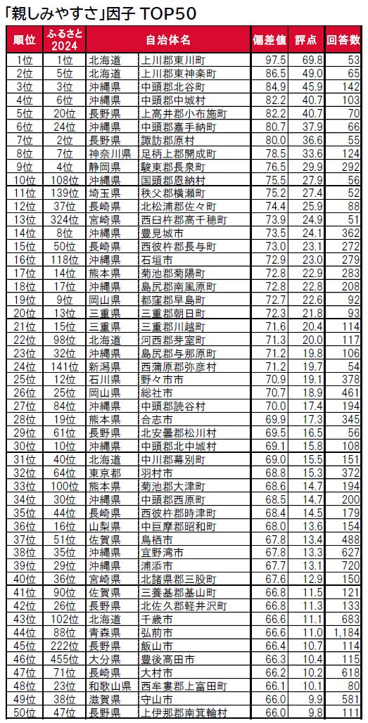 ●「親しみやすさ」因子のトップ10にランクインしている全ての自治体が、郡部に属する「町」もしくは「村」です。また、そのうち7自治体が、「住みここち<ふるさと版>」でもトップ10にランクインしています。