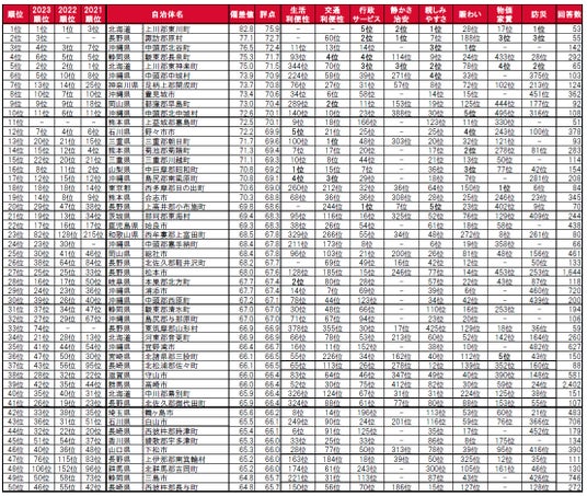 ・2021年~2023年の順位が“-”の自治体は、各年の「街の住みここちランキング<ふるさと版>」で偏差値50未満または回答数が50名未満でランキング対象に含まれなかった自治体を表しています。