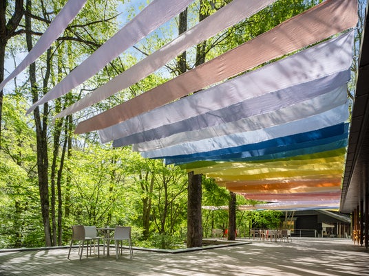 色とりどりの布は、長野県内で収穫されたコブナグサ、クルミ、アカネ、ヤマモモなどの自然の素材で染色されました。1枚ずつ異なる色合いの布がグラデーションをつくります。昨年飾った布を染め直すことにより、さらに深みのある色合いと柔らかい風合いに仕上がりました。風に揺れるインスタレーションを眺めながら、買い物や食事が楽します。
