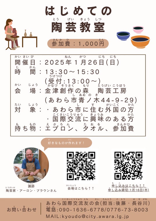 陶芸を通じて異文化交流の輪を広げるイベントが、1月26日にあわら市で開催されます。外国人住民と地域の方々が一緒に楽しみながら交流を深め、あわら市の多文化共生を体感できる絶好の機会です。初心者でも安心して参加できる内容となっています。