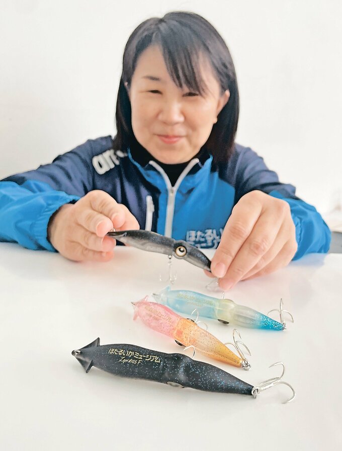 ほたるいかミュージアム(富山県滑川市中川原)は25日から、ホタルイカをかたどった釣り用ルアー(疑似餌)の同館限定色を販売する。釣り具メーカーとコラボレーションした商品で、毎年完売する人気ぶりとなっている。コラボ第3弾の今回は新色として、ホタルイカの特徴である青白い全身発光を模した黒色を作り、愛好家たちの釣果アップに貢献する考えだ。