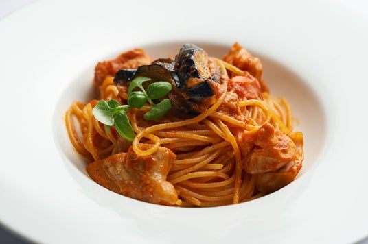 ・チキンコンフィと茄子のピリ辛トマトソーススパゲティ