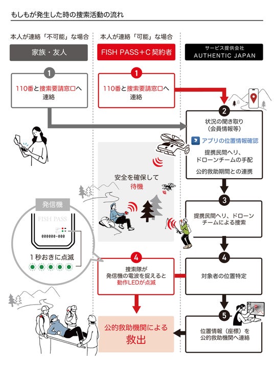 「FISHPASS+C」は、釣行時専用のヘリ捜索サービスです。FISHPASSアプリによるGPS位置情報と、AJ社(ココヘリ)が提供する専用発信機からの電波による高精度な位置特定を組み合わせることで、釣行時の事故における早期発見を実現します。
