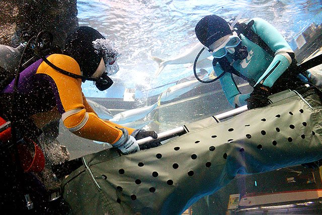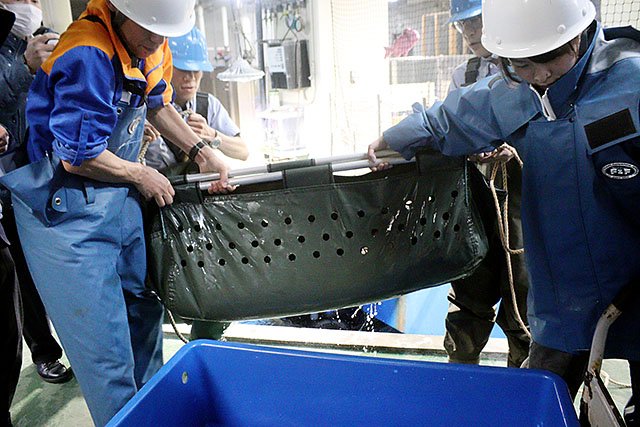 この日は飼育員8人が作業。3人が潜水し、網やシート状の担架を使って、クエ4匹とヒラメ1匹を捕獲した。事前に別水槽に移していたキジハタ2匹とともに輸送用トラックへと運んだ。