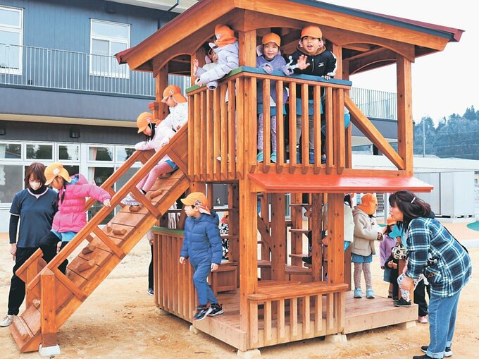 富山県産スギを活用した木製遊具が富山市西大沢(大沢野)の幼保連携型認定こども園「クレヨン」の園庭に完成し、引き渡し式が23日行われた。子どもたちは早速、歓声を上げながら楽しく遊んだ。