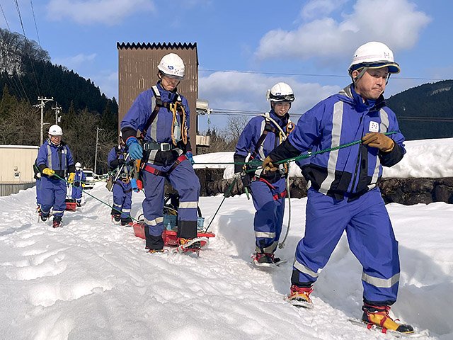 技術向上を目的に毎年実施している。今回は富山支社新川配電部と新川電力部、北電テクノサービス魚津支店の若手社員を中心に参加。40~50センチの雪が積もった中、全員がかんじきを履いて雪上を歩き、資機材を載せて重さ約60キロになったそりを引っ張った。