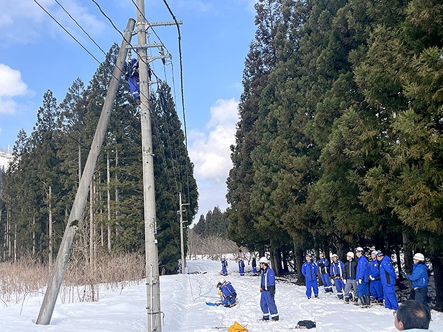 北陸電力送配電は24日、魚津市平沢の片貝第二発電所周辺で降雪期の断線事故などに備えて雪害復旧訓練を行い、28人が安全で迅速な作業手順を確かめた。
