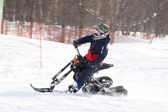 オートバイの前輪にそりを、後輪に無限軌道を装着した車両で、スノーバイクは安定感があり、初心者でも比較的簡単に乗ることができます。ハンドルを使った操作が直感的で、初めてでも楽しめるのが魅力です。